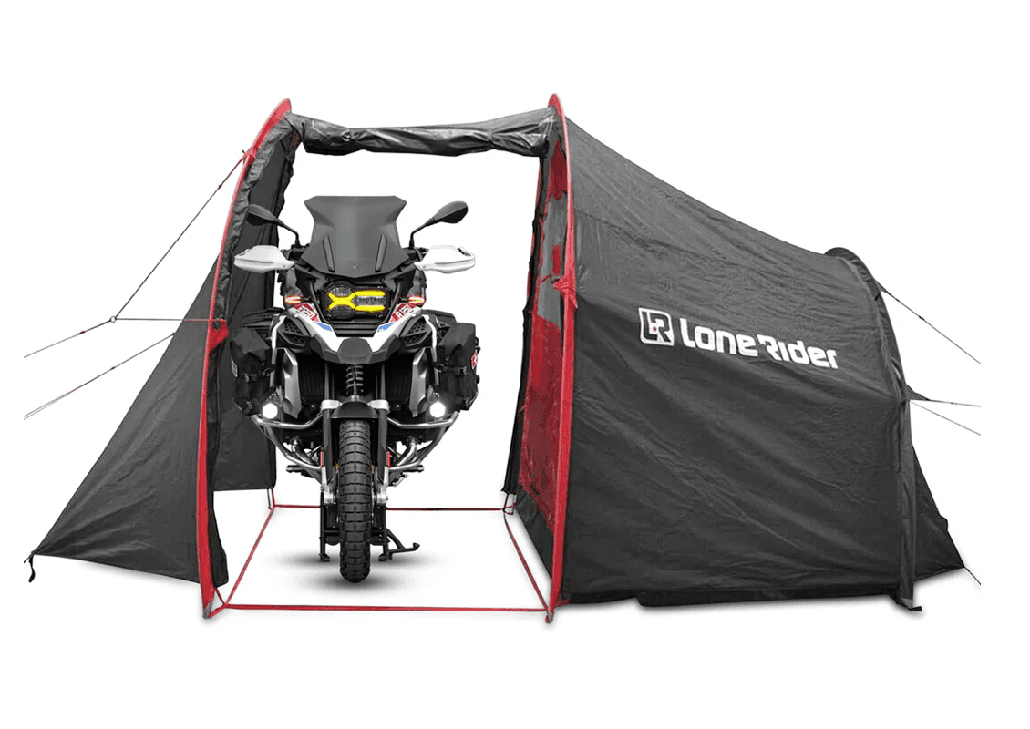 I use a range of motorcycle gear from Lone Rider, including soft bags, a tank bag, top case, auxiliary lights, headlight guard, tent, and more.